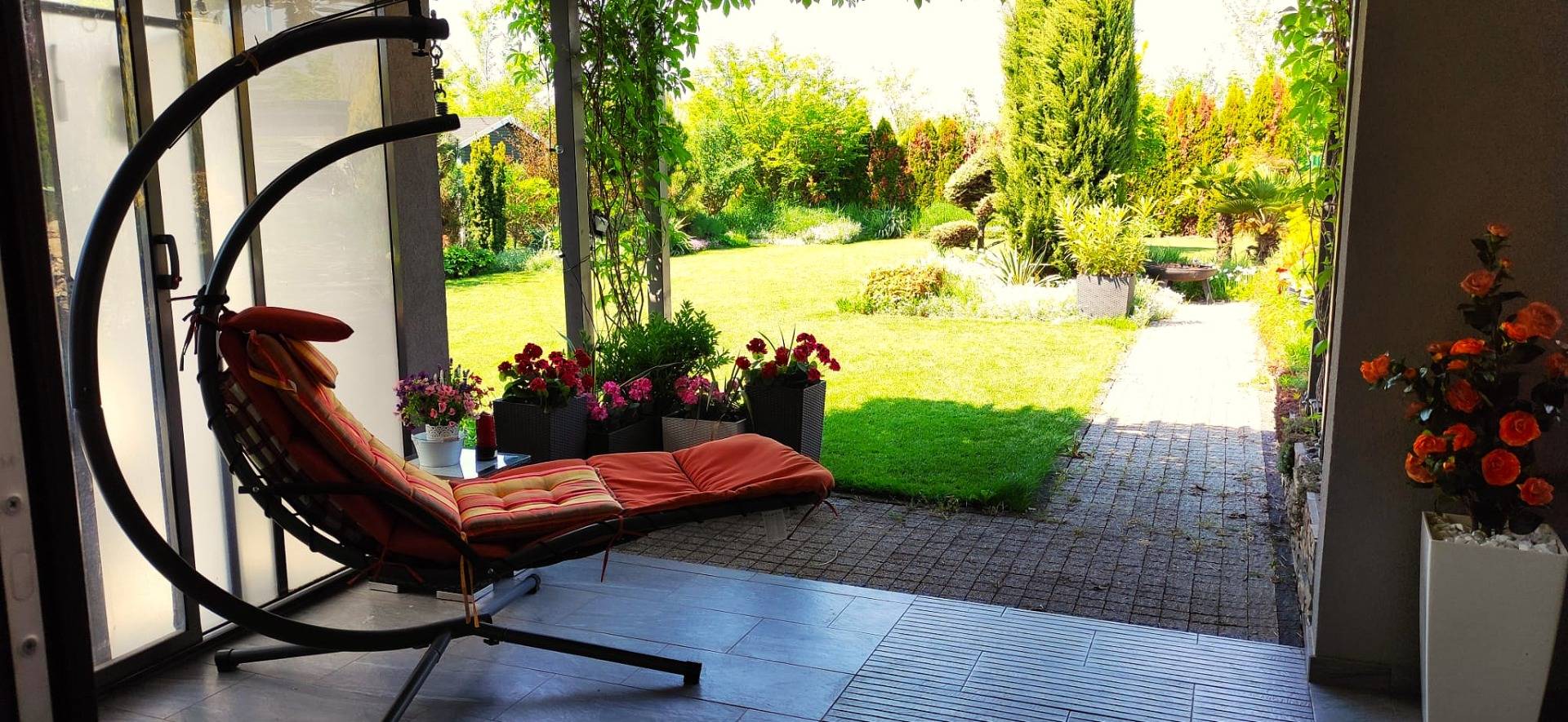 - Wohnzimmer mit Zugang zur Westterrasse und zum Garten