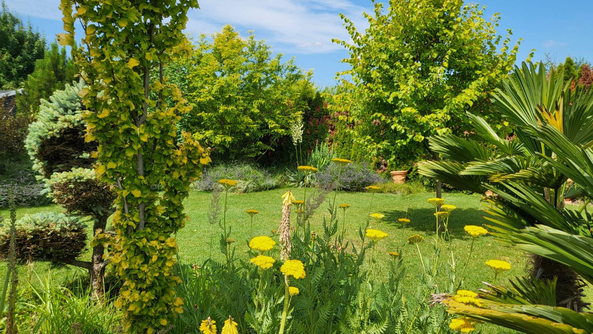 Mediterraner Garten mit Palmen, Yuccas, Lavendel, Oleander und Nadelbäumen