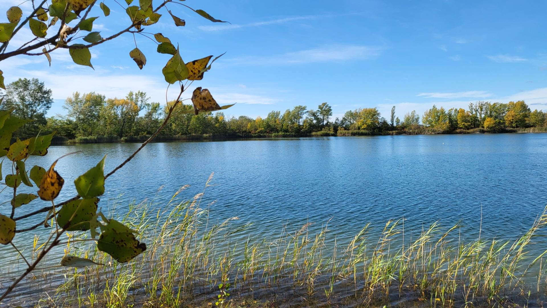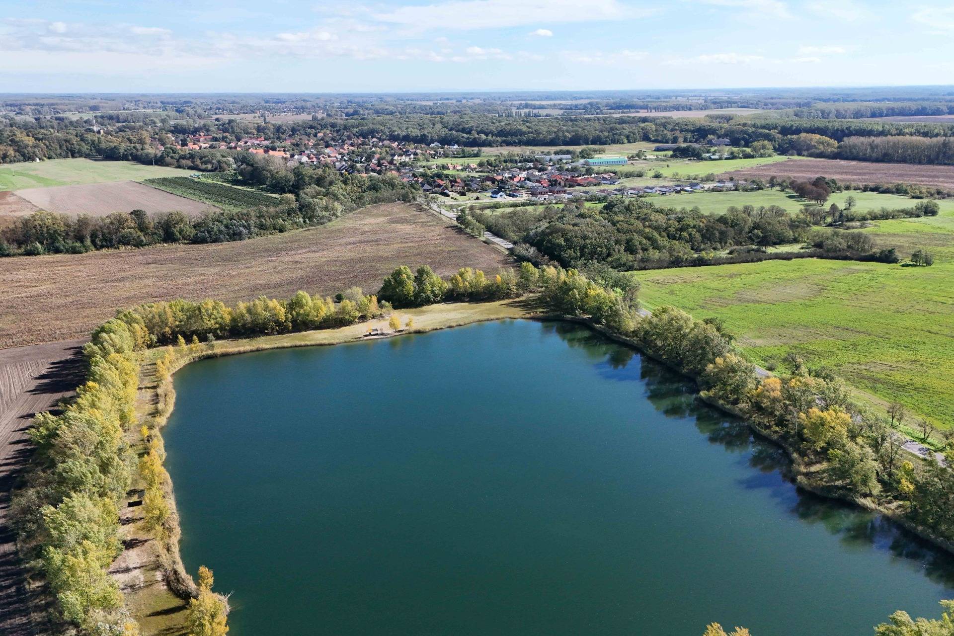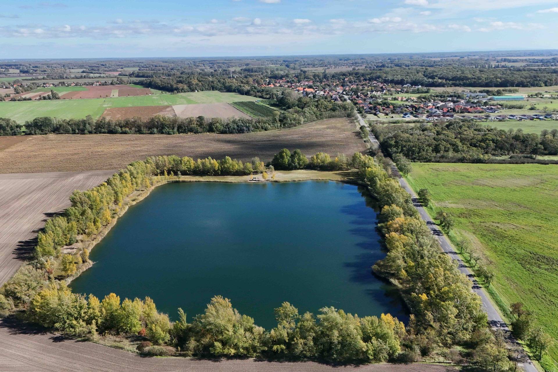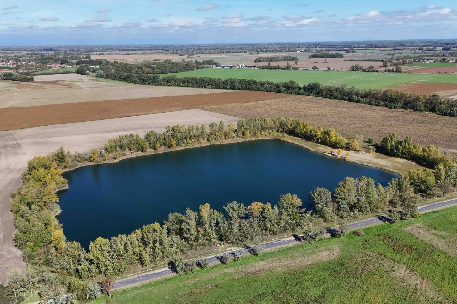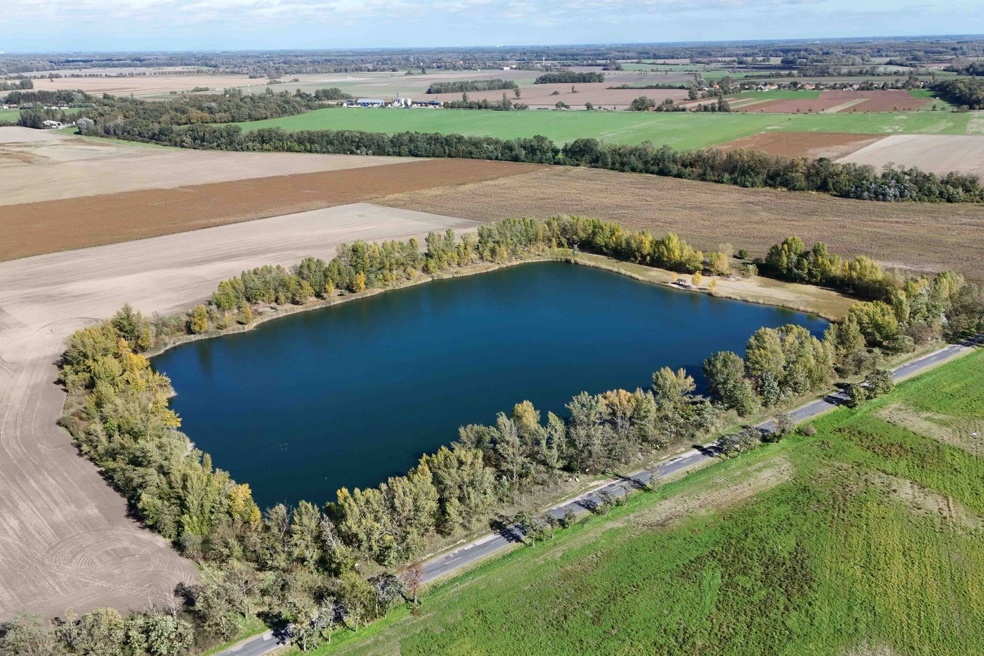 The lake has a depth of 4 to 6 meters, ensuring clear water and a versatile use for leisure activities: swimming, boating, or fishing. Several trees separate the lake from the road.